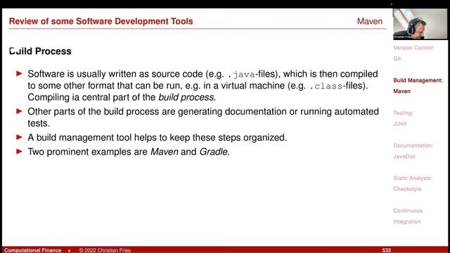 Lecture 2022-1: Session 32: Numerical Methods for Mathematical Finance: Excursus: Software Development Tools - Revision Control: Git - Build Management: Maven - Testing: JUnit - Documentation: JavaDoc - Static Analysis: Checkstyle - Continuous Integration For links to the lecture repository and coding assignments see http://christian-fries.de/finmath/lecture/