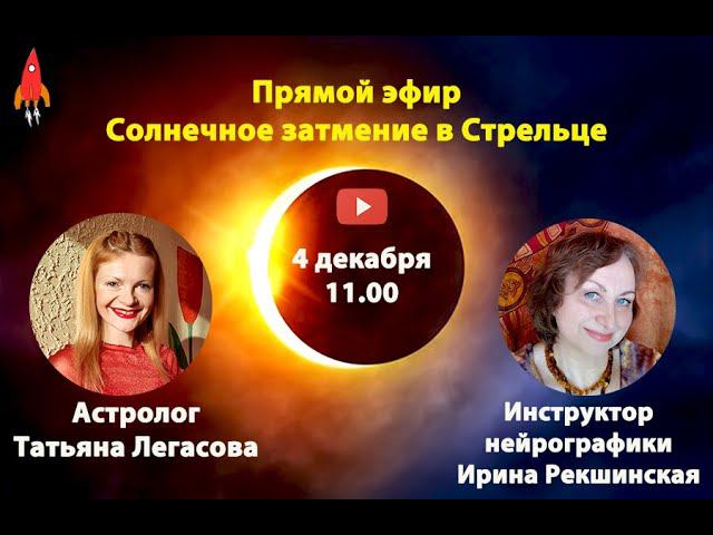 Совместный прямой эфир астролога Татьяны Легасовой и инструктора нейрографики Ирины Рекшинской. Солнечное затмение состоится 4 декабря в 12 градусе Стрельца на звезде Растабан. Рассмотрение точки затмения в домах гороскопа. Рисуем затмение при помощи нейрографики, зажигаем огонь удачи!. Готовьте маркеры / карандаши и бумагу. #школаастрологии #астрологиябесплатно #нейрографика #астронейрохилинг Вайбер/вотцап +7 920 254 26 37. Сайт astrotatianalegasova.ru. ВК - https://vk.com/astroshatl. Фейсбук - https://www.facebook.com/tatianalegasovastro/ ШАТЛ в ИНСТАГРАММЕ https://www.instagram.com/tatianalegasova/ Читать и слушать любовно-фантастические романы Татьяны Легасовой https://clck.ru/SXmwu