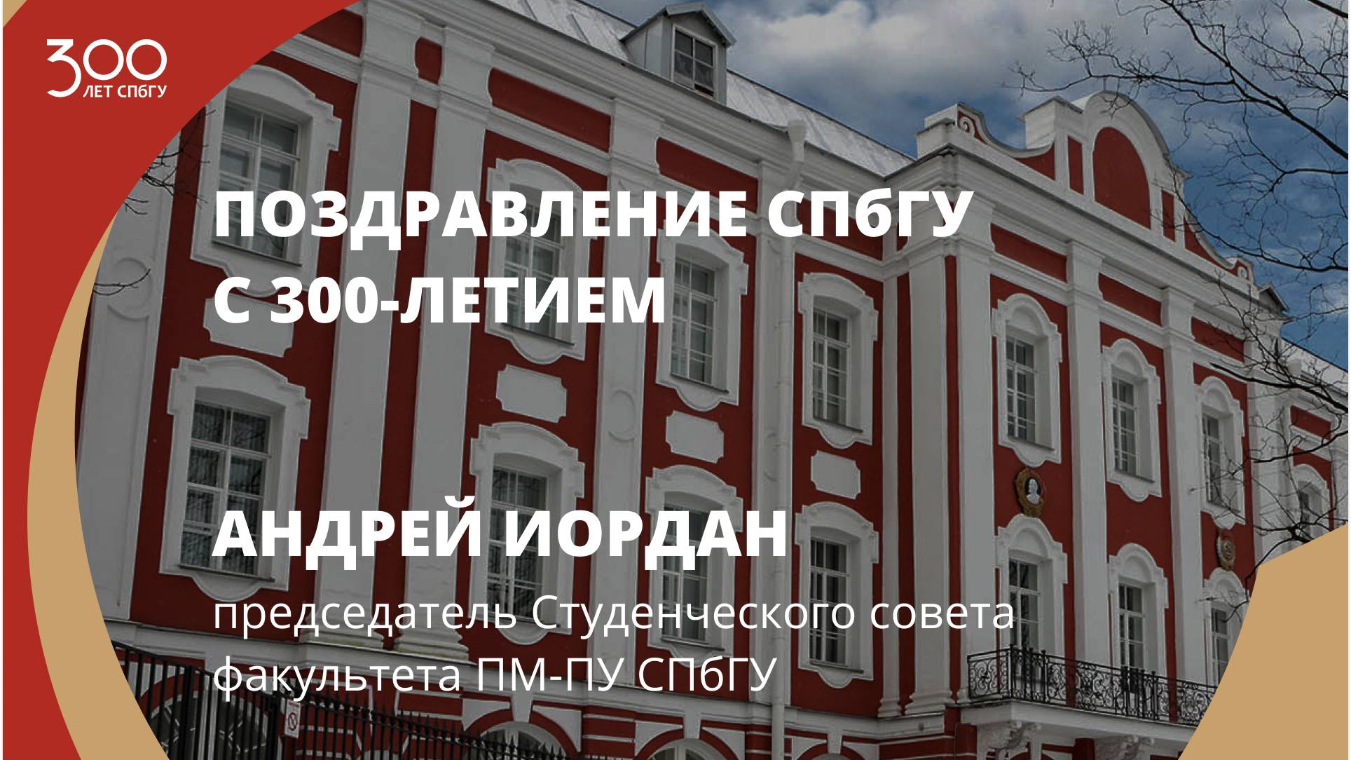 Поздравление СПбГУ с 300-летием от председателя Студенческого совета факультета ПМ-ПУ СПбГУ Андрея Иордана