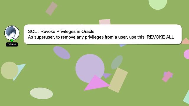SQL : Revoke Privileges in Oracle To Access My Live Chat Page, On Google, Search for "hows tech developer connect" I promised to share a hidden feature with you, and here it is. This is a YouTube's feature which works on Desktop. First, Make sure the video is currently in playing mode. Then, type the letters 'awesome' on the keyboard. You will see a flashing rainbow instead of a regular progress bar on YouTube. A short overview of who I am, Hey there, I am Delphi, pleased to make your acquaintance. I am here to help you get the answers you are seeking. SQL : Revoke Privileges in Oracle Please don't hesitate to let me know if you have more specific queries by commenting or chatting with me. If you have an answer, or any insights to the answer, please comment below. I will express my appreciation for your answer by 'hearting' it. Revoke SQL Oracle in Privileges :