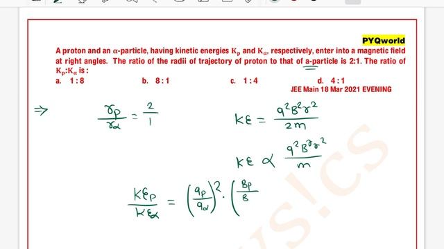 Q.92. A proton and an α-particle, having kinetic energies K_p and K_α, respectively, enter into a magnetic field at right angles. The ratio of the radii of trajectory of proton to that of α-particle is 2:1. The ratio of K_p:K_α is : a. 1 : 8 b. 8 : 1 c. 1 : 4 d. 4 : 1 JEE Main 18 Mar 2021 EVENING #NEET_PYQ #JEE_PYQ