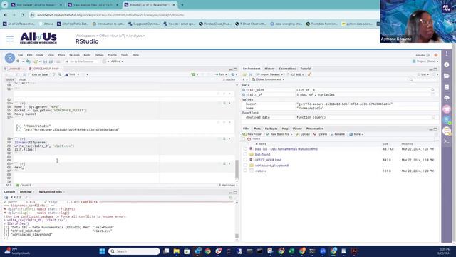 Welcome to another session of our Office Hours! These recordings are your go-to place to discover new features and learn tips and tricks for using the All of Us Researcher Workbench. In this video, Aymone Kouame, M.S., a Data Scientist on our Research Support team, provides an overview of using RStudio in the Researcher Workbench. This presentation includes a live demonstration of pulling in a dataset using the Dataset Builder, creating visualization, and understanding storage options During this Office Hours, you'll learn: - How to start and navigate RStudio - How to wrangle data and save your work Quick links: 0:00 Storage with RStudio 5:05 Starting Rstudio 6:55 Navigating RStudio 8:27 Creating and saving data files 11:55 Importing data files 13:26 Creating R code with Cohort Builder and Dataset Builder 14:53 Basic data coding and file management in RStudio 35:15 Live Q&A If you have any questions, reach out to our support team at support@researchallofus.org #AllofUsResearch #ResearcherWorkbench #HealthResearch #RStudio #MedicalResearch #DataScience #BiomedicalResearch #ResearchCommunity recorded March 22, 2024