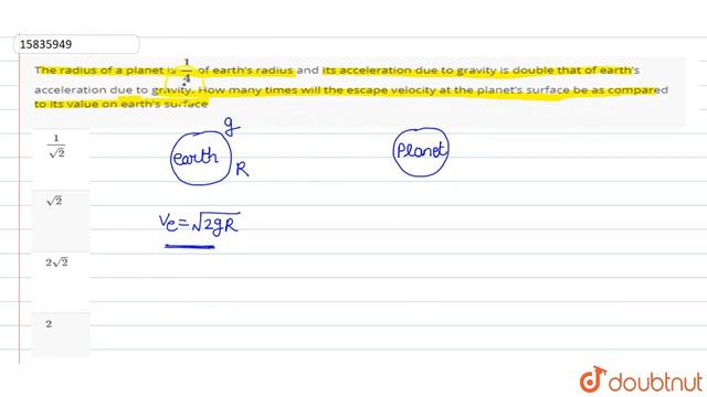 The radius of a planet is 1/4 of earth’s radius and its acceleration due to gravity is double that of earth’s acceleration due to gravity. How many times will the escape velocity at the planet’s surface be as compared to its value on earth’s surface Class: 11 Subject: PHYSICS Chapter: GRAVITATION Board:NEET You can ask any doubt from class 6-12, JEE, NEET, Teaching, SSC, Defense and Banking exam on Doubtnut App or You can Whatsapp us at - 8400400400 Link - https://doubtnut.app.link/2um0jr7Joeb Join our courses to improve your performance and Clear your concepts from basic for Class 6-12 School and Competitive exams (JEE/NEET) - https://doubtnut.app.link/POyZDvv5Lyb Contact Us: 👉 Have Any Query? Ask Us. 🤙 Call: 01247158250 💬 WhatsApp: 8400400400 📧 Email: info@doubtnut.com 🌐 Website: https://www.doubtnut.com Welcome to Doubtnut. Doubtnut is World’s Biggest Platform for Video Solutions of Physics, Chemistry, Maths and Biology Doubts with over 5 million+ Video Solutions. Doubtnut is a Q&A App for Maths, Physics, Chemistry and Biology (up to JEE Advanced and NEET Level), Where You Can Ask Unlimited Questions by Clicking a Picture of Doubt on the Doubtnut App and Get Instant Video Solution. Subscribe Our YouTube Channels: ✿ Doubtnut: https://www.youtube.com/channel/UCcv7pspGHmM7AOywuLM1ufA?sub_confirmation=1 ✿ Class 11-12, JEE & NEET (Hindi): https://www.youtube.com/channel/UCiIrZf4bn1i0IOf8YgSMzWA?sub_confirmation=1 ✿ Class 11-12, JEE & NEET (English):: https://www.youtube.com/channel/UCbJ_xe2bMLo9yuBC-i_13MQ?sub_confirmation=1 ✿ Class 6-10 (Hindi): https://www.youtube.com/channel/UCZnV1hkn5A3fdpTOVi60tzg?sub_confirmation=1 ✿ Class 6-10 (English): https://www.youtube.com/channel/UC9KeHSWOEBXIrbWYasHeSyg?sub_confirmation=1 ✿ Doubtnut Govt. Exams: https://www.youtube.com/channel/UCWPaROsU_06MSqiZ_O6zaVg?sub_confirmation=1 Follow Us: 🔔 Facebook: https://www.facebook.com/doubtnut 🔔 Instagram: https://www.instagram.com/doubtnut 🔔 Telegram: https://t.me/DoubtnutOfficial 🔔 Twitter: https://twitter.com/DoubtnutApp 🔔 LinkedIn: https://www.linkedin.com/company/doubtnut Our Telegram Pages: 🔔 Doubtnut Official: https://t.me/DoubtnutOfficial 🔔 Doubtnut IIT JEE: https://t.me/DoubtnutIITJEE 🔔 Doubtnut NEET: https://t.me/Doubtnut_NEET 🔔 Doubtnut CBSE Boards: https://t.me/DoubtnutCBSEBoards 🔔 Doubtnut UP Boards: https://t.me/DoubtnutUPBoards 🔔 Doubtnut Bihar Boards: https://t.me/DoubtnutBiharBoards 🔔 Doubtnut Government Exams: https://t.me/DoubtnutGovernmentExams class 11 class 11 organic chemistry class 11 physics class 11 chemistry class 11 maths class 11 english class 11 economics class 11 biology class 11 statistics class 11 syllabus physics class 11 commerce class 11 syllabus chemistry class 11 ncert economics class 11 ncert class 11 syllabus cbse class 11 syllabus maths cbse class 11 class 11 english grammar class 11 syllabus class 11 science class 11 syllabus english class 11 syllabus 2020-21 cbse class 11 maths cbse class 11 physics cbse class 11 books cbse class 11 english cbse class 11 chemistry cbse class 11 biology cbse class 11 accountancy cbse class 11 commerce cbse class 11 science class 11 syllabus biology cbse class 11 statistics class 11 syllabus ncert class 11 syllabus of english class 11 syllabus science class 11 syllabus commerce