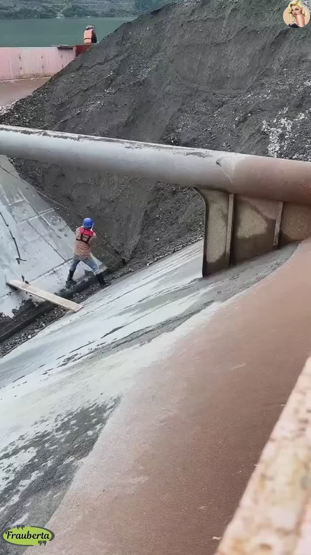 Строительство, разгрузка баржи со щебнем