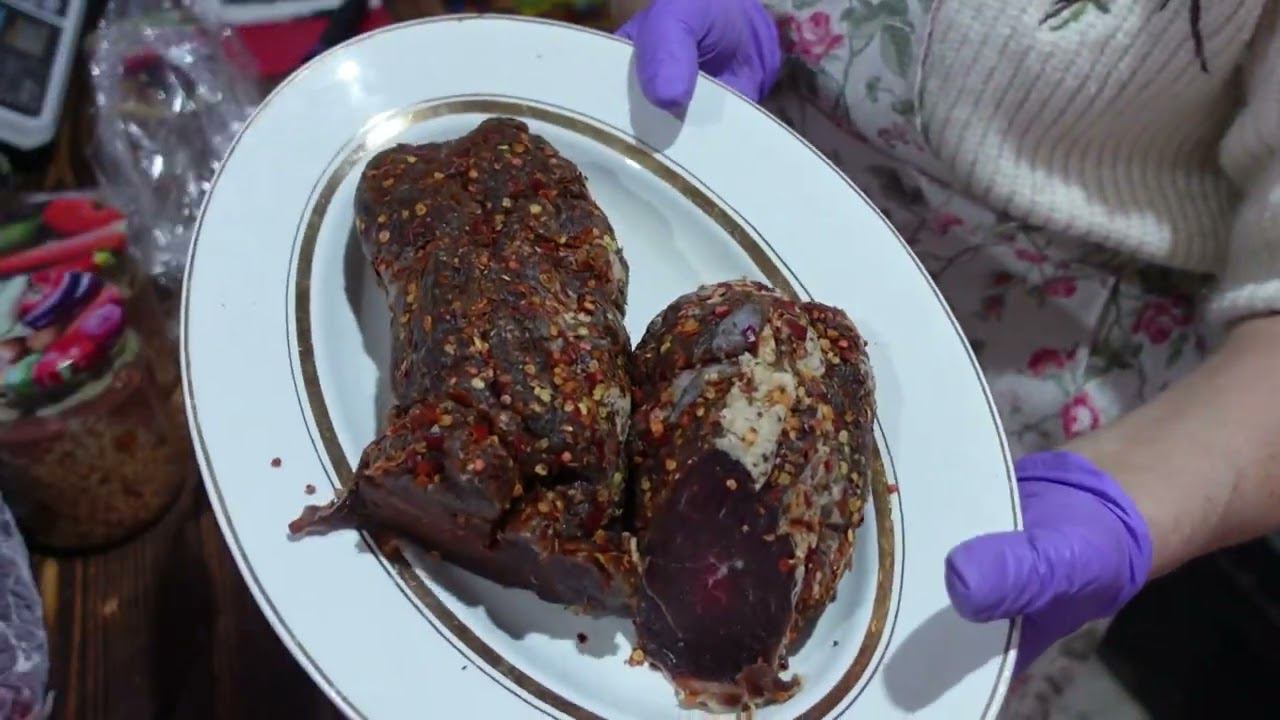 ВЯЛЕНОЕ МЯСО На 1 кг мяса филе КУРИЦА \ИНДЮШКА \КОЗЛЯТИНА\ ГОВЯДИНА перец 0.5 ч.л чеснок 0.5 ч.л сухой или 6 зубчиков свежего. соль 250 гр. кари 0.5 ч.л. куркума 0.5 ч.л перец горошек 0.5 ч.л оригано 0.5 ч.л 50мл. коньяк.(виски) или 100гр водка. специи измельчить, добавить коньяк. (водку) Засыпать мясо солью и смесью специй с коньяком ( водка или виски) Отправляем в холодильник на 3 дня. Мясо выделит много сока. Достаем мясо промываем в нескольких водах. Можно замочить на 1 час. Обсушить, обвалять специями по вкусу. (я обсыпаю обильно перцем крупного или мелкого помола) Подвесить в прохладном помещении на 8-12 дн. Для филе птицы достаточно 3-5 дн. PS Специи для маринада можно использовать на ваш вкус. Мясо кусками 300-400 гр более 36 часов не стоит держать в маринаде.
