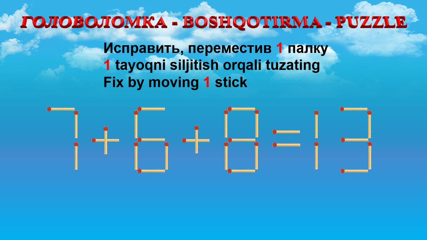 ГОЛОВОЛОМКА - BOSHQOTIRMA – PUZZLE. Спичка. 7+6+8=13, 8-3+6=19, 2+3+6=5, 6-2+2=4