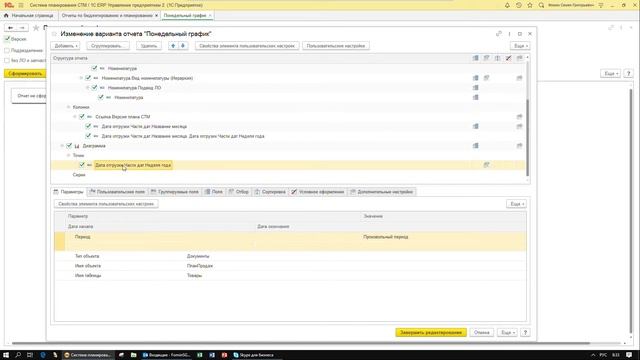 Инструкция по настройке отбора в отчете через Изменение варианта отчета. В меню Изменить вариант отчета доступны более тонкие настройки отчета. В видео приведен пример как можно использовать этот способ настройки отчете для настройки отбора в диаграмме. 1. Через Еще заходим в панель Изменить вариант отчета 2. Переходим в нужны элемент отчет - диаграмму 3. Переходим в Отборы (к диаграмме) 4. Настраиваем нужный отбор - по какой Версии плана СТМ будет строиться линия на диаграмме (07.20 SOP) 5. Сохраняем изменения 6. Строим отчет