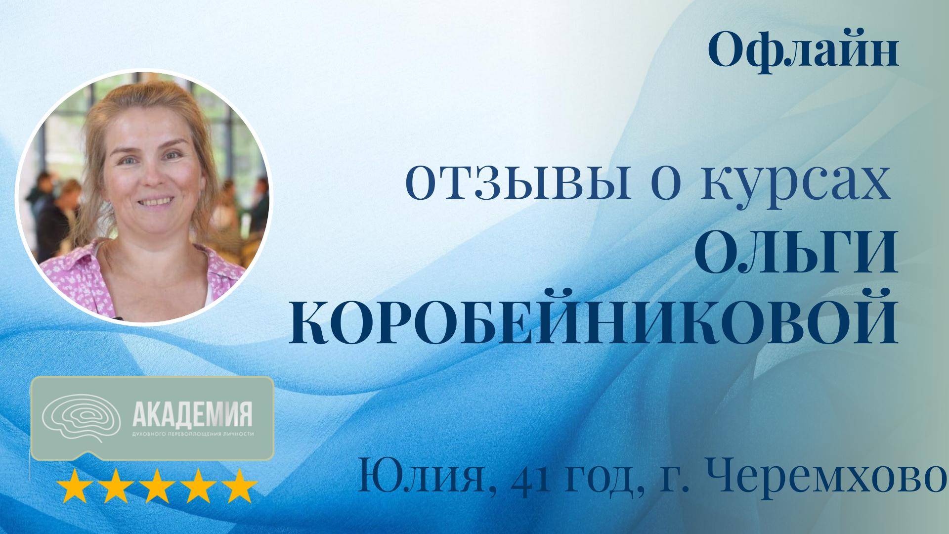 Отзывы о курсе Ольги Коробейниковой: "Офлайн" 93. Юлия, 41 год, г. Черемхово - Курсы: Офлайн Юлия отмечает, что участие в офлайн-сессии дало ей много полезной и важной информации, которая значима как для неё самой, так и для её семьи. Отзывы Юлии показывают, что офлайны Ольги Коробейниковой помогают участникам получать ценные знания, которые способствуют улучшению личной и семейной жизни.