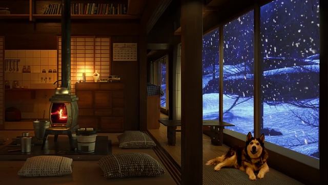 Уютное видео домика с потрескиванием дров в печке, шумом чайника и хаски во время снегопада.