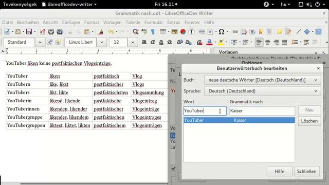User dictionaries of the free and open source LibreOffice office suite allow automatic affixation or compounding, supporting effective editing and technical dictionary creation in several languages. This is a general spell checking improvement of LibreOffice, but it can speed up especially the work of Writer users. Instead of manual handling of hundreds of correct word forms of a new word in a language with rich morphology or compounding, Hunspell spell checker will recognize the new user dictionary word with affixes or in compounds, too, based on a “Grammar By” model word. For a German example, in this video, the word “YouTuber” is one of the new words (missing from the American English dictionary), and “Kaiser” is the model word in the new “Grammar By” or in German, “Grammatik Nach” field (this more common word is part of the Hunspell spell checking dictionary). This way, the new word “YouTuber” will be recognized with suffixes of the word “Kaiser” automatically, too: YouTubern, YouTubers, YouTuberin, YouTuberinnen, also compound forms, like YouTubergruppe, YouTubergruppen etc. With “Grammar By” spell checking, it will be possible to create and handle technical dictionaries more easily, using existing user interface of custom dictionaries to switch on/off them, for example, medical, technological or other scientific dictionaries shipped with LibreOffice. Note: this feature works only in language-dependent user dictionaries, so it needs to create one (see in the video) or modify the language of an existing one. LibreOffice 6.0 Release Notes in German: https://wiki.documentfoundation.org/ReleaseNotes/6.0 Try LibreOffice office suite: https://www.libreoffice.org/download/download/