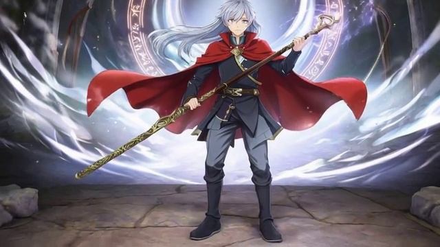 Аниме-стиль: юный маг с посохом стоит перед порталом, его плащ развивается на ветру, позади сверкающие руны. Anime style: A young magician with a staff stands in front of a portal, his cloak fluttering in the wind, and sparkling runes behind him