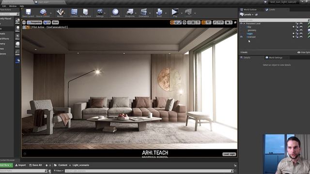 В этом видео Станислав Козловский продолжит показывать как переключить освещение в Unreal Engine и настроит всё необходимое с помощью блюпринт (blueprint) Часть 1 "Как переключить освещение в Unreal Engine | Включение и выключение света в UE | Подготовка сцены " - https://youtu.be/HGkaErT5JtE Содержание " Как переключить освещение в Unreal Engine | Включение и выключение света в UE с блюпринт ": 0:00 Введение 2:54 Открытие блюпринт (Blueprint) уровня в Unreal Engine 4 3:07 Выбор экшенов для блюпринта в Unreal Engine 4:08 Настраиваем порядок загрузки световых схем в Unreal 5:40 Используем MultiGate для множественного выбора в UE (Unreal 4) 6:54 Проверяем настройки переключения освещения в сцене в Unreal Engine 7:10 Устанавливаем старт внутри сцены Unreal 8:10 Проверяем почему не загружается overcast (пасмурная погода) в Unreal Engine 4 11:45 Находим ошибку загрузки overcast (пасмурной погоды) в Unreal Engine 15:00 Проверяем проект Unreal Engine в скомпилированном видe 17:10 Помещаем в основной уровень Unreal пост-процесс 20:09 Заключение ⭕ Подробная информация об обучении Unreal Engine 4 и запись на курс: http://unreal.arhiteach.com/ ⭕ Вебинар, где подробно рассказано о курсе Unreal Engine 4 https://youtu.be/HvpxSDC67KQ?t=2766 ⭕ Подписывайтесь на наш канал по архитектурной визуалиции в Telegram https://t.me/arhiteach ⭕ Портфолио преподавателя: http://ricci-concept.it/stanislav_kozlovskiy/ ⭕ По вопросам обучения и как стать профи в 3D и начать зарабатывать на своих знаниях: http://arhiteach.com 8-800-1000-984 8-495-777-0186 info@arhiteach.com ⭕ Мы в соц. сетях https://tele.click/arhiteach https://vk.com/arhi.teach https://www.facebook.com/arhi.teach/ https://www.instagram.com/arhiteach_3dmax/