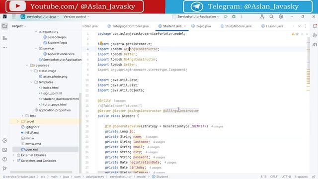 Задонатить: https://yoomoney.ru/to/4100110584940159 На собесах требуют опыт коммерческой разработки. Разрабатывайте этот сервис для тьютора вместе со мной, слушайте мои объяснения, пишите код, вникайте, чтоб на собеседовании вы могли открыть этот код и по нему объяснить свой опыт и навыки. Ссылка на GitHub с проектом на Java и на Kotlin: https://github.com/AslanJavasky/servicefortutor_java https://github.com/AslanJavasky/servicefortutor_kotlin Задонатить преподавателю: Карта Сбер: 5469 6000 2144 3601 (Аслан) ЯндексДеньги(YouMoney):4100110584940159 Спасибо :)