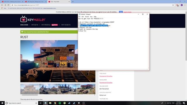 1.Go on https://www.keymailer.co/g/games/10387 2.Register yourself (already do) 3.Make a video with the hashtag #playrust 4.Request the key 5.wait to receive the key 6.Have Fun #rust
