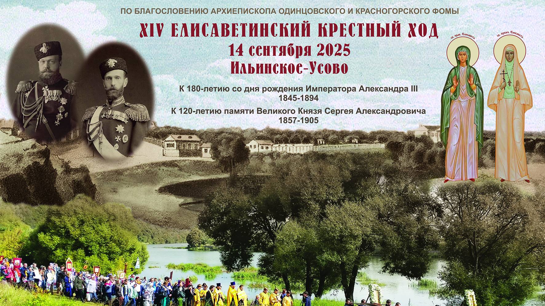 XIV Елисаветинский крестный ход к 180-летию со дня рождения Императора Александра III (1845-1894), к120-летию памяти Великого Князя Сергея Александровича (1857-1905), Московского генерал-губернатора, командующего войсками Московского военного округа, владельца Императорского имения Ильинское-Усово 14 сентября по благословению архиепископа Одинцовского и Красногорского Фомы при поддержке Администраций Одинцовского и Красногорского городских округов в Подмосковье, в историческом Императорском имении Ильинское-Усово, прошел XIV Елисаветинский крестный ход. Организаторами ежегодно выступают приход храма Спаса Нерукотворного образа в селе Усово и Фонд содействия возрождению традиций милосердия и благотворительности "Елисаветинско- Сергиевское просветительское общество". Мероприятие проводится в память об августейших владельцах имения, подвижниках милосердия и благотворительности – Императрице Марии Александровне (1824-1880), Императоре Александре II (1818-1881), Великом Князе Сергее Александровиче (1857-1905) и его Августейшей супруге, святой преподобномученице Великой Княгине Елисавете Феодоровне (1864-1918), сподвижнике Великокняжеской четы священномученике Сергии Махаеве (1874-1937). По традиции крестный ход проходит в день, ближайший к именинам Великой Княгини – дню памяти святой праведной Елисаветы, матери Иоанна Крестителя. В этом году событие приурочено к важным памятным датам: к 120-летию со дня трагической гибели Августейшего владельца имения Ильинское-Усово, Московского генерал-губернатора, командующего войсками Московского военного округа, благотворителя и мецената Великого Князя Сергея Александровича (1857-1905) и 180-летию со дня рождения его старшего брата - Императора Александра III (1845-1894), неоднократно посещавшего подмосковное имение.