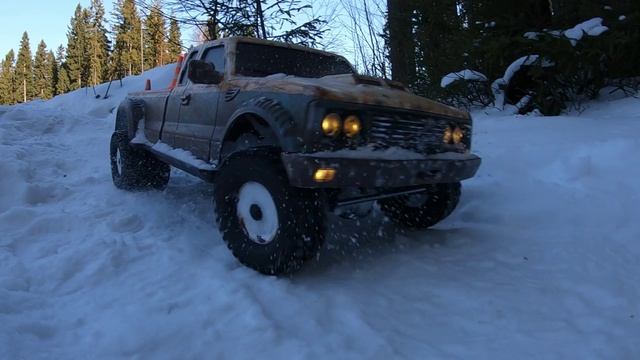 Внедорожник со спаркой колес на зимнем бездорожье.