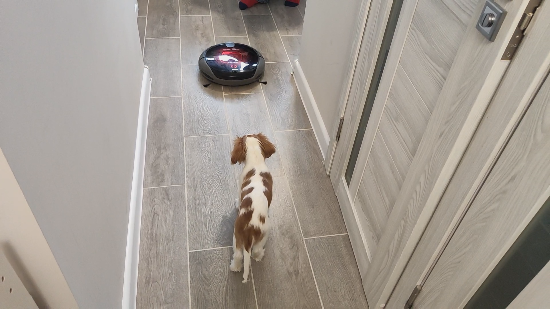 Собака Кавалер Кинг Чарльз спаниель и робот-пылесос