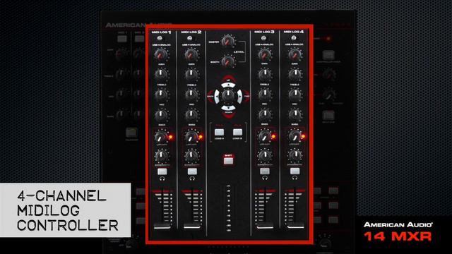 The American Audio MXR Series offers DJs the tactile feel and operation of a traditional DJ mixer while playing and controlling music from software on their computer. The 14 MXR is a 4-Channel MIDILOG™ Mixer with Midi/Analog control, built-in DSP D-Core Sound Card with 4-In/4-Out audio interface, Balanced XLR Outputs, MIDI Navigation Controls and user assignable control buttons to make it easy to customize and play your music. Specifications: • 14-inch, 4-Channel MIDILOG™ Mixer (compatible with any "Midi Learn" Software or Analog Inputs -- such as CD Players, Turntables, etc.) • Inputs: 4 Line, 2 Phono, 2 Mic • 20 On-board Midi Control Buttons (Mapable) • MIDI interface (USB MIDI I/O) • Built-in DSP D-Core™ Sound Card with 4-In/4-Out audio interface • Controller Mode: When activated USB output streams are routed through master and headphone outputs • Balanced XLR Outputs • 3-Band EQ with Rotary Kills (Treble, Mid & Bass) • Midi Navigation Controls to allow easy software navigation of your music library • Crossfader Curve Adjustment • Crossfader Channel Assign • Master, Booth, Headphone Level & Mix Controls • Microphone Volume Control, Talkover + 3-Band EQ (Treble, Mid & Bass) • Low/High Pass Filter with Bandwidth Control per channel • 10 segment VU meter • Audio inputs: RCA • Microphone inputs: 2x Balanced ¼"/XLR Combo • Headphone input: ¼" Stereo • Multi-voltage operation: AC 100V~240V 50/60Hz • Dimensions (LxWxH): 14.25"x13.75"x 3.5" / 356x320x85mm • Weight: 10 lbs. / 4.5 kg. Specifications to change without notice.