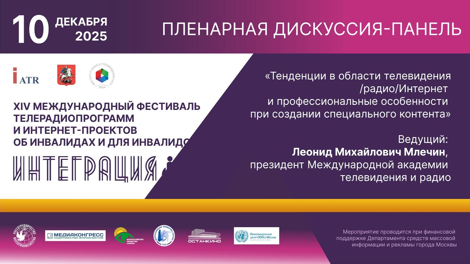 Пленарная дискуссия-панель «Тенденции в области телевидения/радио/интернет и профессиональные особенности при создании специального контента». Ведущий: Леонид Млечин, президент Международной академии телевидения и радио