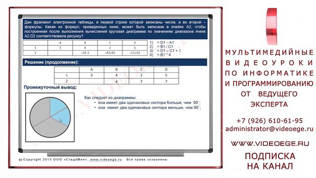 http://www.videoege.ru - мультимедийный сайт по информатике и программированию. Дан фрагмент электронной таблицы. A B C D 1 3 4 2 5 2 =D1--1 =A1+B1 =C1+D1 Какая из формул, приведённых ниже, может быть записана в ячейке A2, чтобы построенная после выполнения вычислений диаграмма по значениям диапазона ячеек A2:D2 соответствовала рисунку? 1) =D1--A1 2) =B1/C1 3) =D1--C1+1 4) =B1*4 Решения: 1. https://www.youtube.com/watch?v=jJYTyfE2qlU 2. https://www.youtube.com/watch?v=KPoovA1Eb0o 3. https://www.youtube.com/watch?v=nSDbYP_eVzY 4. https://www.youtube.com/watch?v=ti_JDmSNjGo 5. https://www.youtube.com/watch?v=XyHaZXLN_IU 6. https://www.youtube.com/watch?v=wqFyeKKnj74 7. https://www.youtube.com/watch?v=_z40fAhVjnY 8. https://www.youtube.com/watch?v=bwt13uD3_uM 9. https://www.youtube.com/watch?v=zcQ_p9c7JMM 10. https://www.youtube.com/watch?v=-WV4-wPQgFw 11. https://www.youtube.com/watch?v=6bCbHX1zui8 12. https://www.youtube.com/watch?v=CWtpKqrSUk4 13. https://www.youtube.com/watch?v=uxsAtryIDb8 14. https://www.youtube.com/watch?v=fWHZq3fg8Uk 15. https://www.youtube.com/watch?v=Uyj_52rqXvY 16. https://www.youtube.com/watch?v=V9kbnxmhFns 17. https://www.youtube.com/watch?v=Q1ZUSXj5RO0 18. https://www.youtube.com/watch?v=PKhC1NJO5Do 19. https://www.youtube.com/watch?v=LXb4_5W3FSc 20.1. https://www.youtube.com/watch?v=Ch70metu29Y 20.2. https://www.youtube.com/watch?v=T99i5gz9Ldw