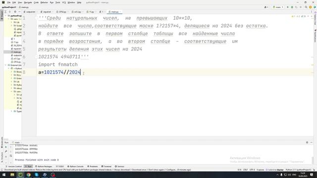 Среди натуральных чисел, не превышающих 10**10, найдите все числа, соответствующие маске 1?2157*4, делящиеся на 2024 без остатка. В ответе запишите в первом столбце таблицы все найденные числа в порядке возрастания, а во втором столбце – соответствующие им результаты деления этих чисел на 2024