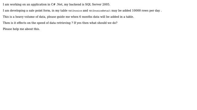 How to manage more than 1000000 rows in a table in SQL Server 2005? Helpful? Please support me on Patreon: https://www.patreon.com/roelvandepaar With thanks & praise to God, and with thanks to the many people who have made this project possible! | Content (except music & images) licensed under CC BY-SA https://meta.stackexchange.com/help/licensing | Music: https://www.bensound.com/licensing | Images: https://stocksnap.io/license & others | With thanks to user Yousf (serverfault.com/users/54935), user tkrabec (serverfault.com/users/91463), user Joel Coel (serverfault.com/users/2869), user Haider Ali Wajihi (serverfault.com/users/229687), and the Stack Exchange Network (serverfault.com/questions/311275). Trademarks are property of their respective owners. Disclaimer: All information is provided "AS IS" without warranty of any kind. You are responsible for your own actions. Please contact me if anything is amiss at Roel D.OT VandePaar A.T gmail.com