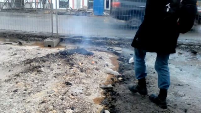 Омич греется о горящую кучу песка с гвоздями. Любинский проспект.