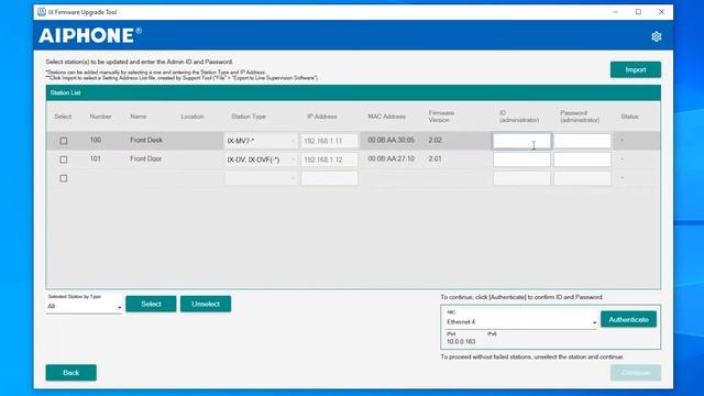 Update IX Series 2 Stations to the latest firmware version using the Firmware Upgrade Tool. Download the Firmware Upgrade Tool here: https://www.aiphone.com/wp-content/uploads/FirmwareUpgradeTool_V1001.zip Download the Firmware here: https://www.aiphone.com/home/resource-library#firmware IX series 2 systems include these components: IX-MV7-B, IX-MV7-HB, IX-MV7-W, IX-MV7-HW, IX-DV, IX-DVF, IX-DVF-P, IX-RS-B, IX-RS-W, IX-BA, IX-DVF-4, IX-SSA-2RA-FR, IX-DVF-2RA-FR, IX-SSA-2RA, IX-SSA-RA, IX-SSA, IX-SS-2G, IX-DVF-2RA, IX-DVF-RA, IX-DVF-P, IX-DVF, IX-SSA-RA-FR, IX-DA, IX-NVP2, IX-DVF-RA-FR, IX-DV, and IXW-MA.
