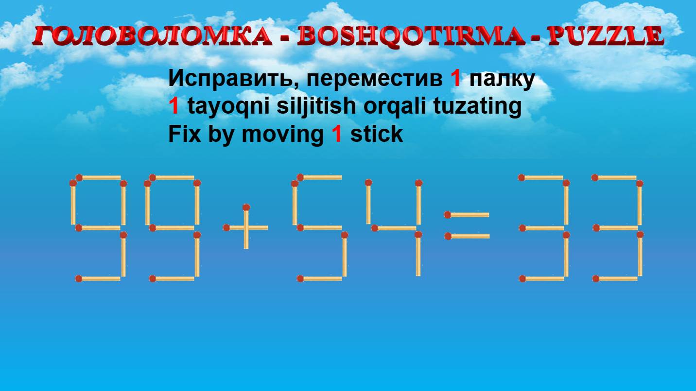 ГОЛОВОЛОМКА - BOSHQOTIRMA – PUZZLE. Спичка. 99+54=33, 56+24=98, 46+38=88, 98+34=32