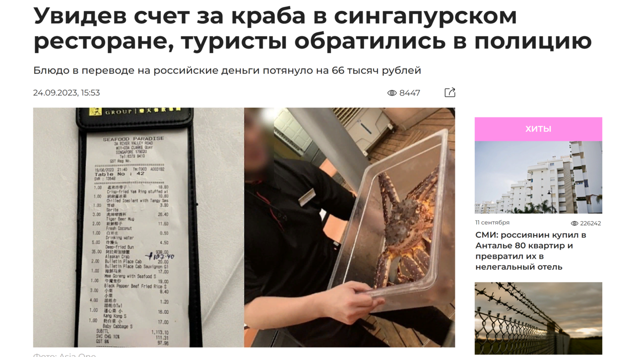 Новости туризма 24/09/2023 Увидев счет за краба в ресторане Сингапура туристы обратились в полицию