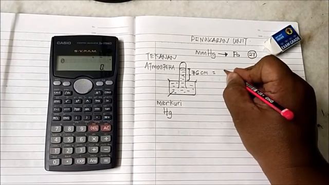 kita tahu tekanan atmosfera 76cmHg (Barometer merkuri). Untuk tukar 76cmHg ke Pascal dengan CALCULATOR pastinya menambah minat murid untuk menerokai rahsia CALCULATOR CASIO fx-570MS.