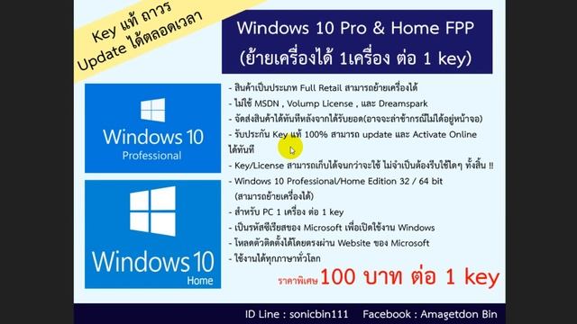 ปิดการขาย Key แท้ Windows 10 Pro & Home FPP ย้ายเครื่องได้ 100 บาท(สินค้าหมด)