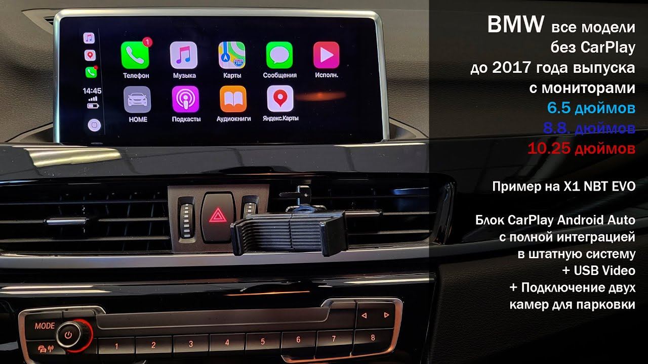 Интерфейс CarPlay/Android Auto работает в беспроводном и проводном режиме, имеет входы для подключения камер заднего и переднего вида, поддерживает систему Miraсast и Mirroring (зеркальное отображение смартфона), как опция возможна активация HDMI входа для подключения TB приставки. Интерфейс подходит к следующим моделям BMW : 5 серия F10 F11 F07 GT : 2009 - 2016 (для CIC и NBT, оригинальный экран 6,5 ", 8,8" и 10,25 ") 5 серии F10 F11 F07 GT : 2017 - 2020 (для Evo , оригинальный 8,8 "экран и 10,25 экран) 7 серий F01 F02 F03 F04 : 2009 - 2016 (для CIC и NBT, оригинальный экран 6,5 ", 8,8" и 10,25 ") 7 серия F01 F02 F03 F04 : 2016 - 2020 (для системы Evo, оригинальный 10,25 экран) X5 F15 : 2014 - 2016 с системой NBT X5 F15 : 2017 - 2020 с системой EVO X6 F16 : 2014 - 2016 с системой NBT X6 F16 : 2017 - 2020 с системой EVO X1 F48 : 2016 - 2017 с системой NBT X1 F48 : 2018 - 2020 с системой EVO X3 F25 : 2011 - 2016 (для систем CIC и NBT, оригинальный экран 6,5 "и 8,8") X3 F25 : 2018 - 2020 (для Evo Системы, оригинальный 8,8 "экран и 10,25 экран) X4 F26 : 2011 - 2016 (для систем CIC и NBT, оригинальный экран 6,5 "и 8,8") X4 F26 : 2016 - 2019 (для системы Evo, оригинальный 10,25 экран) X5 E70 : 2011 - 2013 с CIC системой X6 E71 : 2011 - 2014 с CIC системой X1 E84 : 2009 - 2015 с CIC системой (с оригинальным заводским экраном) 1 серия F20 F21 : 2011 - 2012 с CIC системой 3 серии F30 F31 F34 F35 : 2011 - 2012 с CIC системой 5 серия F10 F11 : 2009 - 2012 с CIC системой 5 серия F07 GT : 2009 - 2012 с CIC системой 7 серия F01 F02 : 2009 - 2012 с CIC системой X1 E84 : 2009 - 2015 с CIC системой X3 / X4 F25 F26 : 2011 - 2013 с CIC системой X5 E70 : 2011 - 2013 с CIC системой X6 E71 : 2011 - 2014 с CIC системой i3 I01 : 2012 - 2017 с системой NBT i3 I01 : 2017 - 2020 с системой EVO