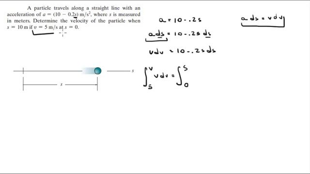 Determine the velocity of the particle when s = 10 m if v = 5 m/s at s = 0