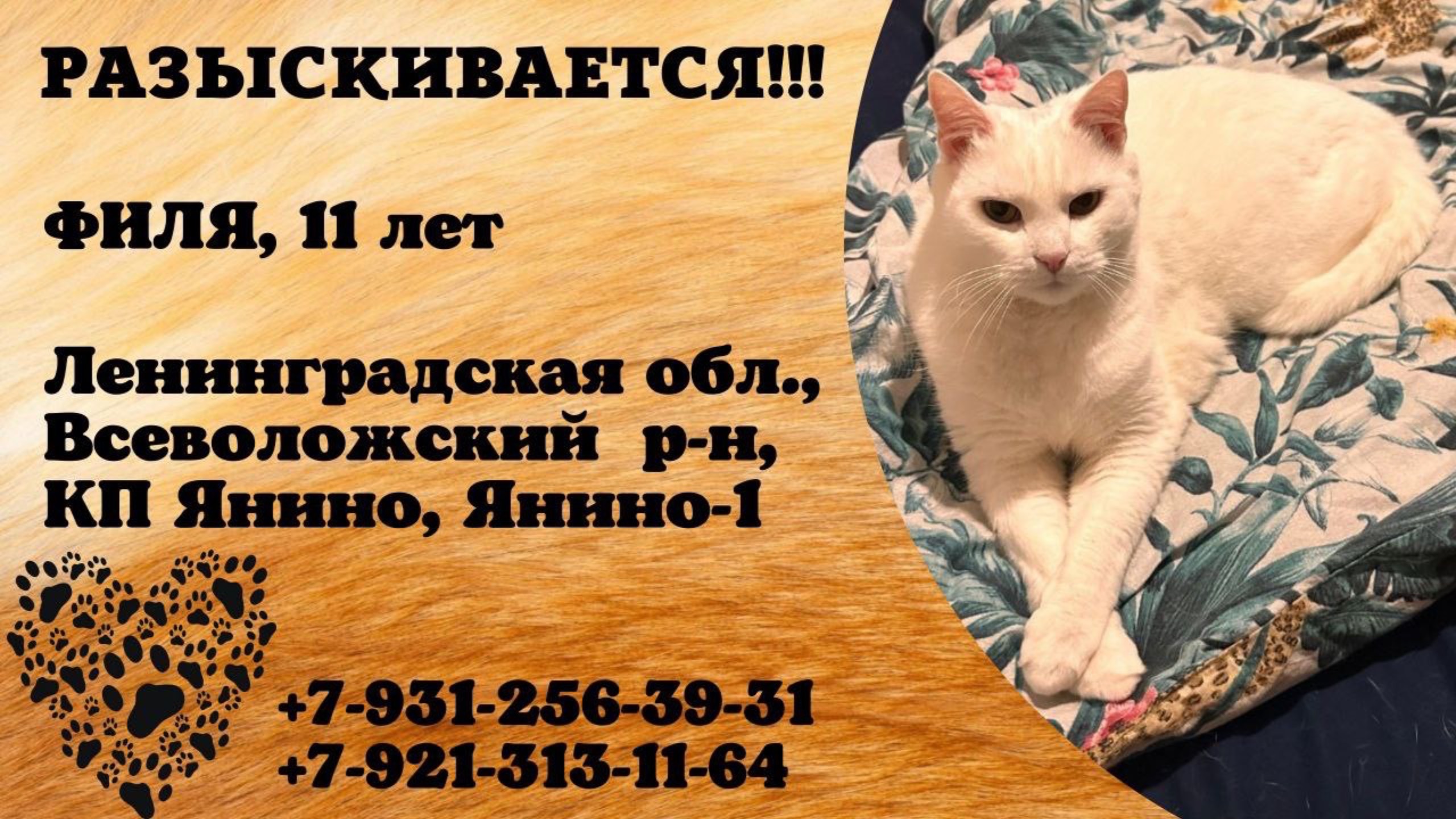 Ленинградская Янино-1, КП Янино, Пропал кот 24.07 Сиреневый бульвар 29 Все еще ищем🙏🏻 Кличка Филя, крупный, белый, шерсть короткая но густая, 11 лет, кастрирован, большие желтые глаза, контактный, но скорее всего сейчас на стрессе. Особые приметы серое пятно на макушке в виде стрелочки, и небольшое серое пятно на хвосте. Проживаем в небольшом закрытом поселке Янино, гулял только в районе своего таунхауса, не вернулся домой и больше его не видели. Есть подозрения что его могли вывезти. Без ошейника. Очень ждем дома и переживаем, пожалуйста помогите его найти, будем благодарны за любую информацию!!! Диана +79312563931 Денис +79213131164 Автор: https://vk.com/id218480199 Инфо: https://vk.com/wall-198815410_211454 #пропал_кот #Ленинградская #янино