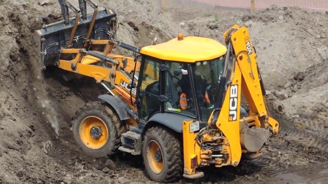 Экскаватор-погрузчик загружает Автокран перемещает