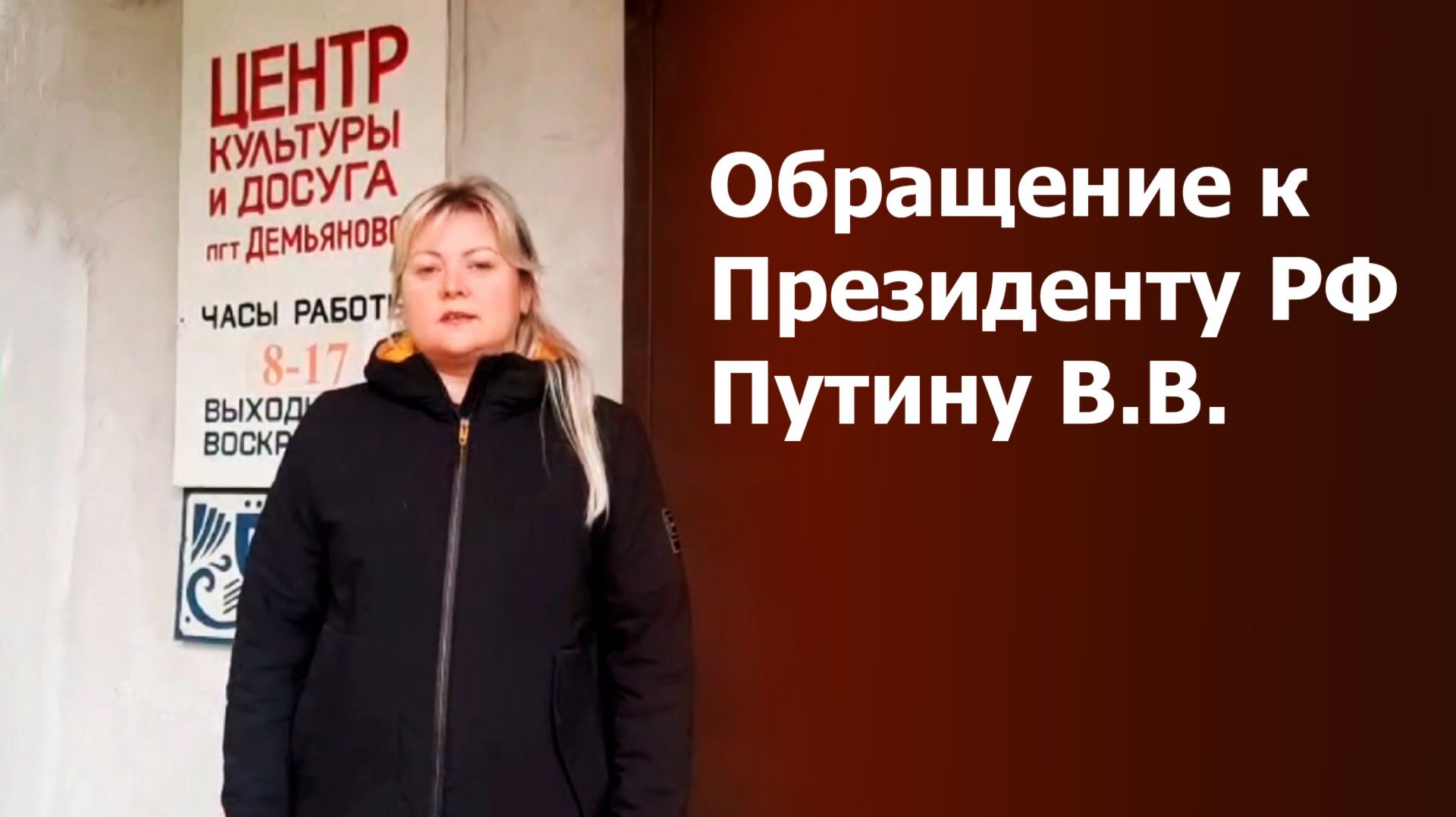Видеообращение работников ЦКиД Демьяново Подосиновского района Кировской области и жителей посёлка Демьяново к Президенту Российской Федерации Путину Владимиру Владимировичу и депутатам Государственной Думы с просьбой оказать помощь в решении вопроса о строительстве в Демьянове нового культурного центра.