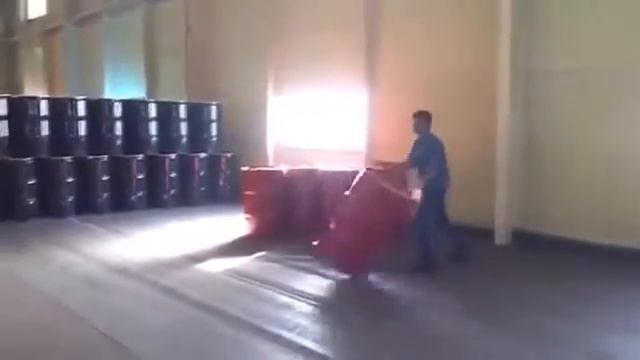 Сотрудники склада неплохо приловчились перемещать железные бочки.