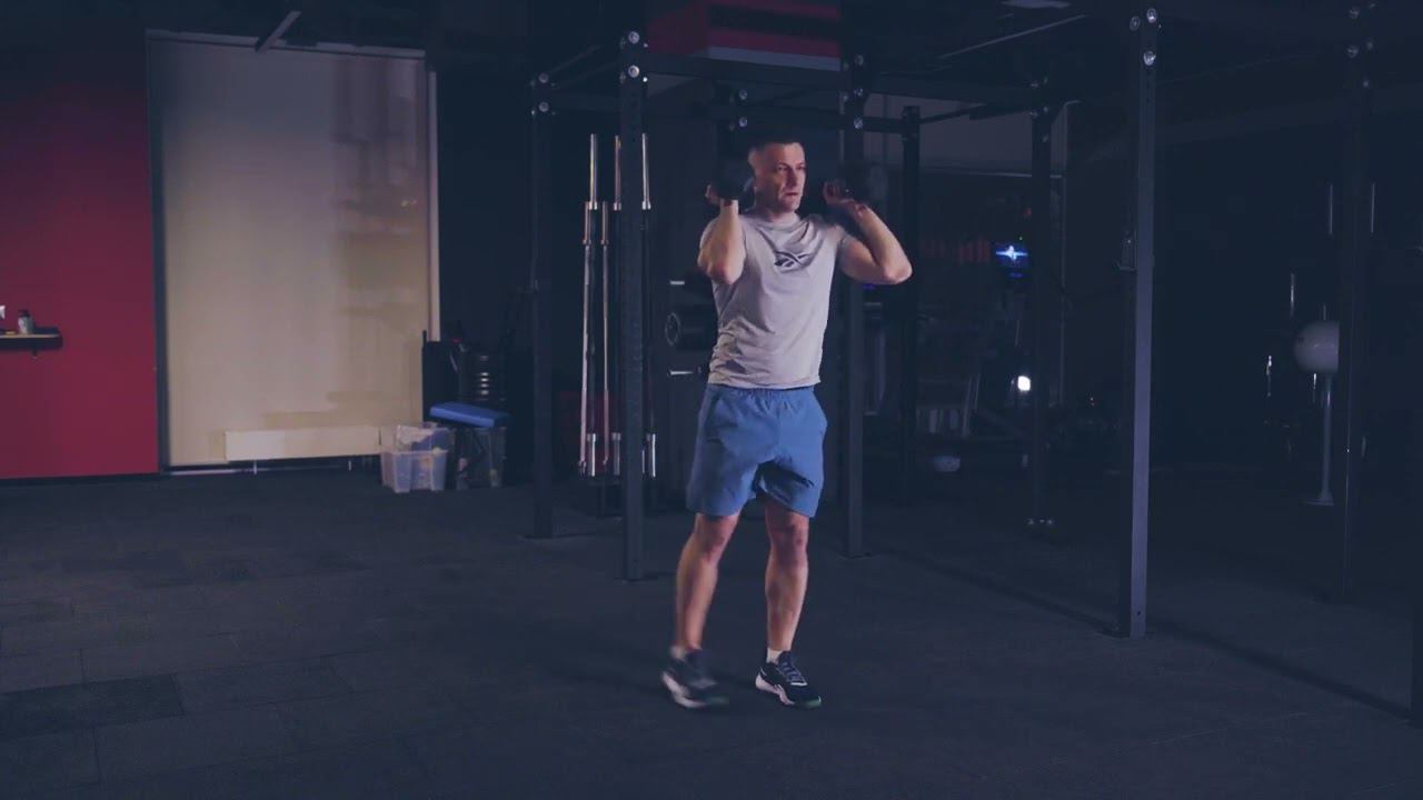 Выпад шагом назад с гантелями на плечах/ Reverse lunge front rack dual db