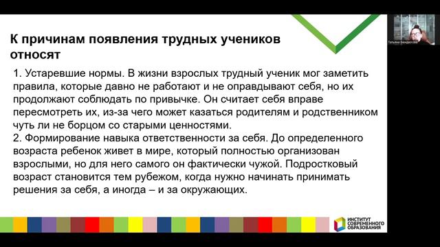 На вебинаре слушатели смогут получить представление о личностных особенностях и поведении современных трудных учеников и молодежи и том, как развивать контакт с ними. На вебинаре слушатели смогут получить представление о личностных особенностях и поведении современных трудных учеников и молодежи и том, как развивать контакт с ними Институт современного образования (ИСО) Об институте: Автономная некоммерческая организация дополнительного профессионального образования «Институт современного образования» Учредителем АНО ДПО «Институт современного образования» является АОНО ВО «Институт менеджмента, маркетинга и финансов» - это вуз, который более 30 лет занимается подготовкой востребованных кадров. 5 направлений деятельности АНО ДПО «Институт современного образования»: • Повышение квалификации, профессиональная переподготовка и профессиональное обучение для работников сферы образования. • Повышение квалификации и профессиональная переподготовка в сфере менеджмента, управления персоналом, бухгалтерского учёта, контрактных закупок, охраны труда, обеспечения безопасности, сервиса и оказания услуг населению и ещё более 30 направлений. • Курсы английского языка и программирования для взрослых и детей. • Корпоративные курсы и тренинги по направлениям подготовки. • Индивидуальные учебные программы под потребности организаций или обучающегося. Ключевые преимущества для наших слушателей: • Гарантия качества знаний • Удобно • Финансово выгодно Если вы хотите сменить профессию или расти и развиваться в своей — переходите на наш сайт https://isoedu.ru/, выбирайте образовательную программу и записывайтесь на обучение. Наша задача – чтобы каждый желающий получил качественное образование по приемлемым ценам. Контакты: Сайт: www.isoedu.ru ВК: https://vk.com/isoedu E-mail: dpo@doiso.ru, info@isoedu.ru По вопросам обучения (сроки обучения, проверка работ, выдача документов) обращайтесь по телефонам: +7 (910) 240-21-37, (910) 732-86-78.