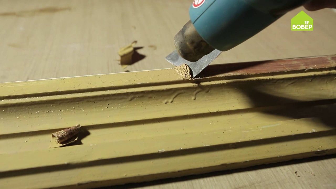 Снимаем старую краску при помощи строительного фена и шпателя