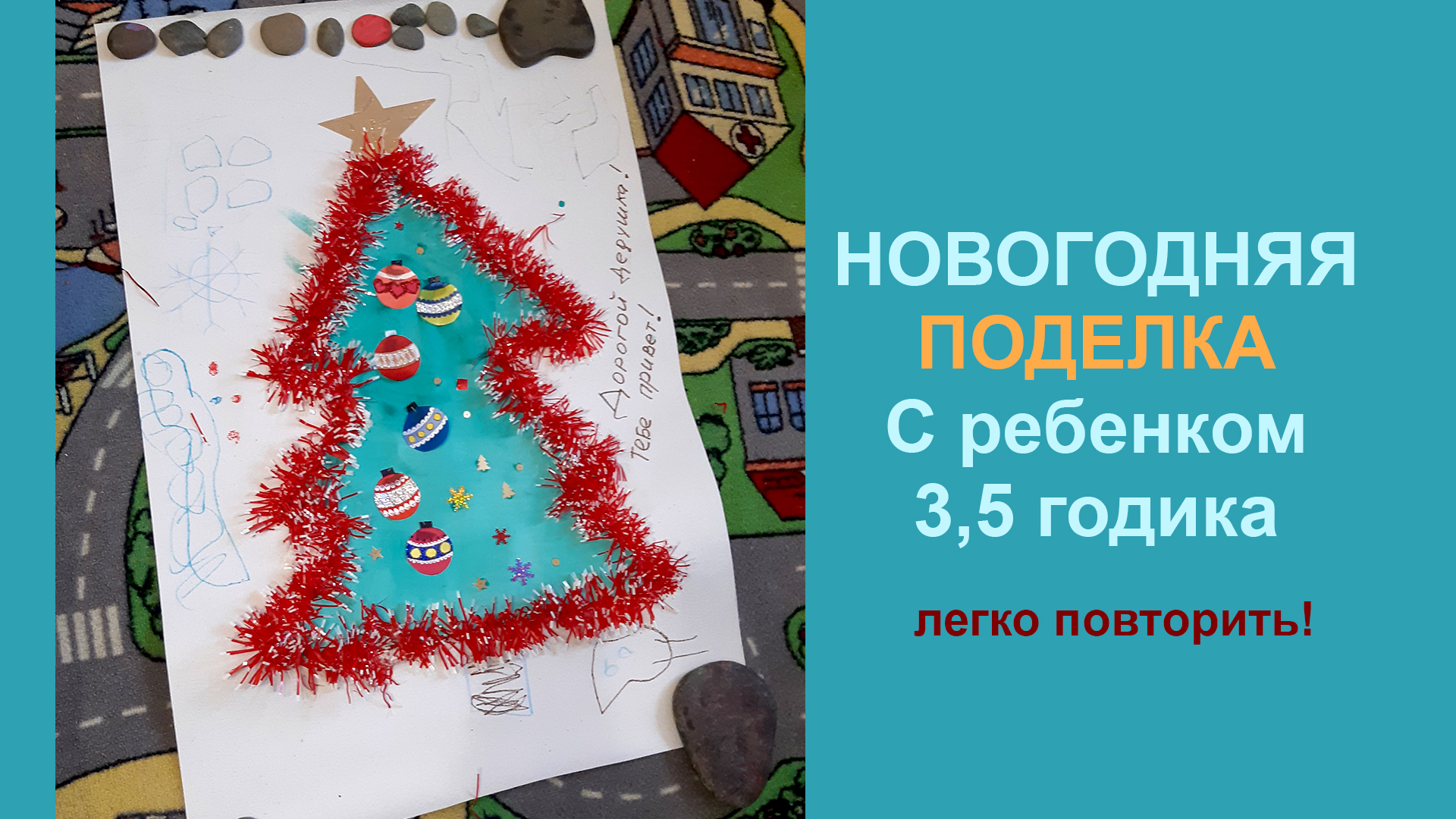 С маленьким ребенком мы изготовили объемный плакат с Новым годом, для прадедушки Максима. Максиму на видео всего 3,5 годика, он уже вполне может создавать поделки, вместе с мамой!