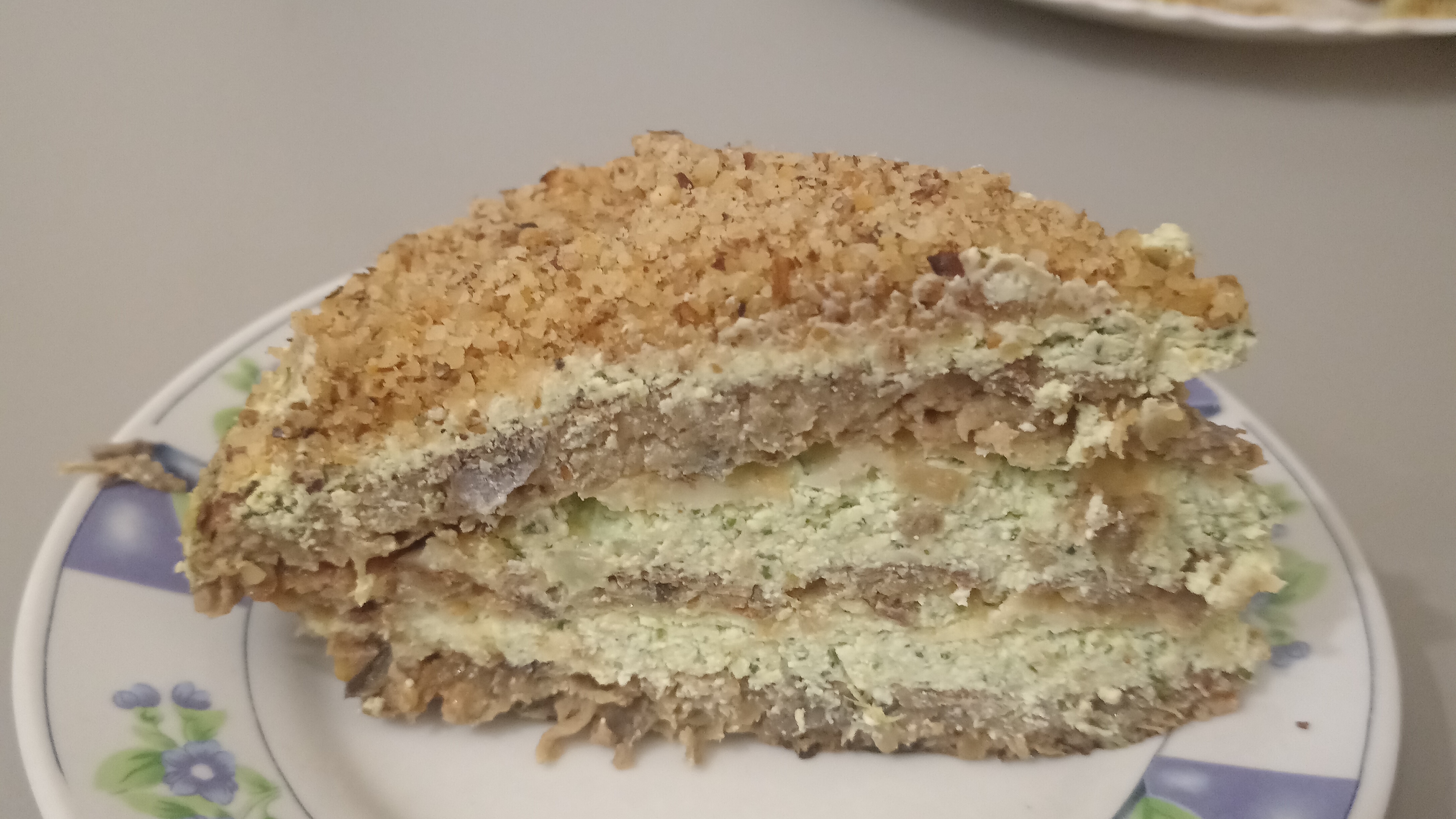 Отменный закусочный торт без мяса😋 потребуется : Полкило баклажан 3 яйца категории 1 2-2,5ст.л муки Растительное масло - для обжарки коржиков Начинка:400гр творога 2ст.л сметаны Чеснок-3 зубчика Зелень-укроп, петрушка, кинза Красный жгучий перец Немного сыра Грецкий орех - 50гр для посыпки Соль