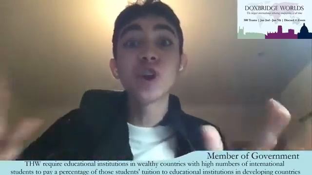 Motion: THW require educational institutions in wealthy countries with high numbers of international students to pay a percentage of those students' tuition to educational institutions in developing countries OG: Habib AF (Mahad Akbar, Hamza Farookhi) OO: [Did not consent to be recorded] CG: Eton College B (John Chang, Maxwell DeLorenzo) CO: DSDC JI (Igor Pemberton, Joep van Heugten) Panel: Namita Pandey (c), Nar Sher May, Umar Buckus Result: OG and OO advance