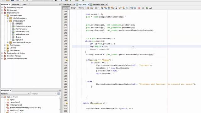 In this tutorial you will learn how to display employee username after logging in. Its a great idea for a payroll system, since you can see every employee is doing what. public static String empname; String username = rs.getString("username"); Emp.empname = username; lbl_emp.setText(String.valueOf(Emp.empname).toString()); Project Scope This is an introduction of a simple Java Employee Payroll Management System (Payroll System) using SQLITE database that was developed using Java Netbeans. Furthermore the use of GUI components to achieve this project are as follows: JButton,JTable,IText,JComboBox, JLabel,JRadioButton, JFrame,JPanel,Image Icons, JTextField. Functions used Add Record Deleted Record Update Record Clear Fields Login Logout Date & Time PDF Objective of Java Payroll Project Employee Management System. The main objective of the Java Project on Payroll Management System is to manage the details of Employees, Payments, Salary. It also manages all information about the Employee, Payroll and Salary Slips. The project is totally built at administrator end of things. Only the administrator is guaranteed the access. The purpose of the project is to build an application that reduces the manual work and it can be used as a school project. Functionalists provided by the Java Project on Employee Payroll Management System. 1- Provides search facility such as searching for Employees, Salaries and reports. 2- Tracks all salaries and employee payments. 3- Stores all information about employees to a secure Sql database. 4- Generates reports using iText. 5- Manages all information of Employees. 6- Simple GUI. 7- Editing, adding, deleting and updating records couldn't be easier. 8- Manages all information of employees salaries. 9- Uploading Pictures of Employees. 10- Audit Trail to monitor activities. 11- Manages all information of employee payslips. 12- Manages all information of employee allowance. 13- Manages all information of employee deduction. Report generation. 1- It generates reports of all employees, Payments and salary slips. 2- You can easily export PDF for employee , Payroll, Payslips , Allowance and deduction records. 3. Save PDF to any location. Download Files here: https://www.dropbox.com/s/ps6zvfz158yqtvp/Employee%20Payroll.rar?dl=0 #java tutorial for beginners #java tutorial Thanks for watching.