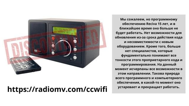 Внимание к радиослушателям имеющим радиоприемник модели CC WiFi Вся информация на нашем вебсайт - https://radiomv.com/ccwifi Уважаемые радиослушатели, с сожалением объявляем, что приёмники от компании CC WiFi (фото приёмника на заставке видео) больше не будут работать. Компания заблокировала сервера предоставляющее трансляцию и закрыла доступ к интернету для этой версии приёмников, и больше не будет предоставлять услуги трансляции. Это не вина RadioMv, никто не знал и не думал, что такое могло произойти. Мы приносим наши извинения, но к сожалению решения этой проблемы нет, как только приобрести приёмник другой модели. Вся информация на нашем вебсайт - https://radiomv.com/ccwifi