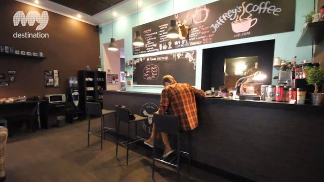 Jeffrey's Coffee is a unique blend of timeclub and American coffee bar. Paying only for the time you'll get delicious coffee by professional barista, various sweets, tea and cold drinks. During daytime Jeffrey's is perfect for doing a little work in quiet and cozy atmosphere, fixing a couple of business meetings or reading by the fireplace, sitting in the rocking chair. But the night comes and Jeffrey gets jazzy - guests play darts, kicker and Playstation. Free-and-easy students make their way to Jeffrey's café to play table games, listen to live music or simply talk about the latest gossips. Jeffrey's Coffee has become a place in Moscow so much like the one, where the famous Friends loved to get together with a cup of coffee. And the interior with the flagship leather sofa recreates perfectly that atmosphere. The whole design concept seems to reflect the motto "E pluribus unum", written on American coin. Indeed, an all-in-one harmonious picture is made out of many colors, furniture and decoration elements. Jeffrey's 'look' sheds homeyness and warmth, on the one hand, and energizes and sets for creativity, on the other hand. The brand colors vary from dark to light: ash-grey, turquoise, and purple, triggering positive emotions. Find out more: http://myde.st/1uQ4