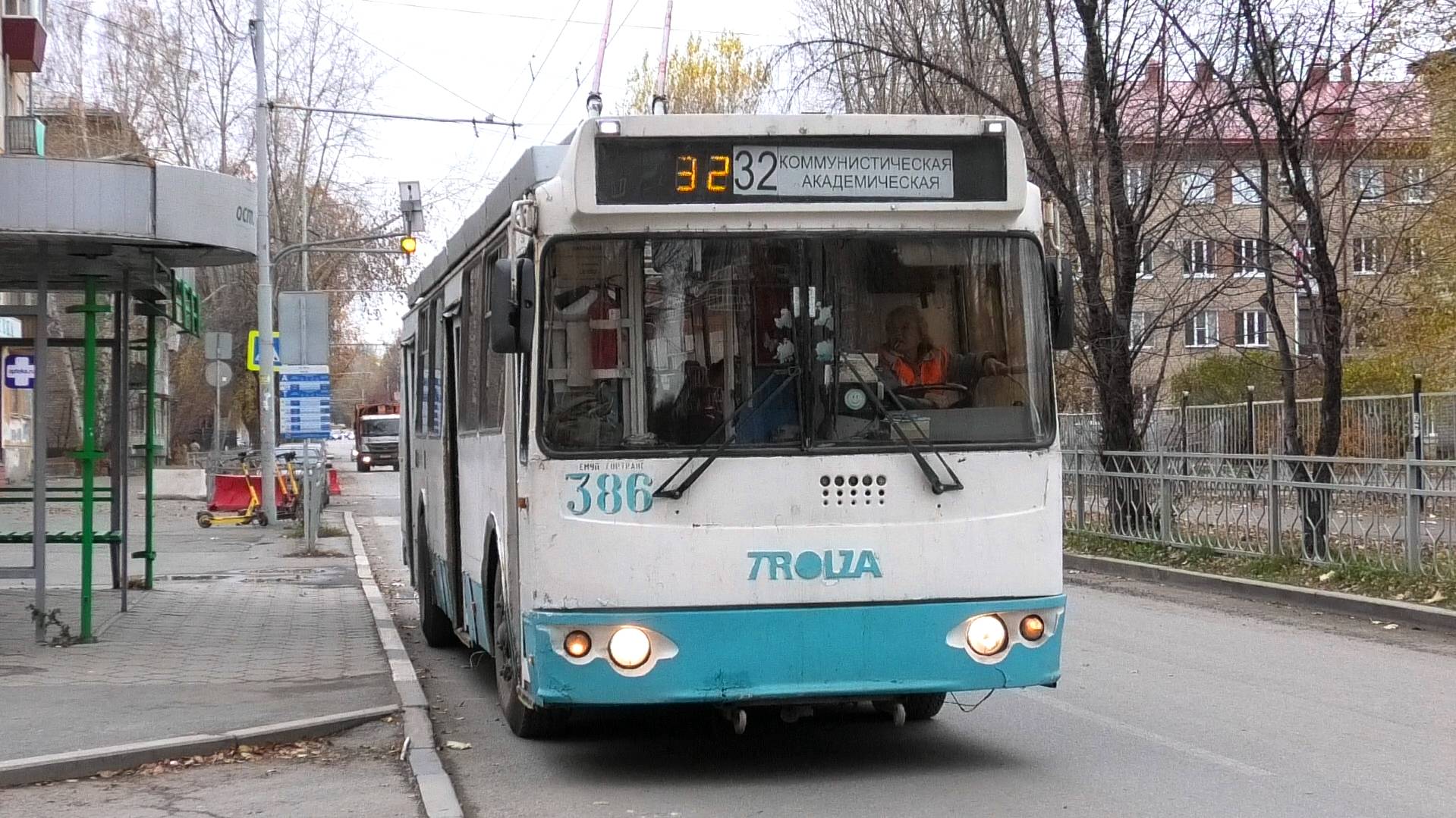 Троллейбус ЗиУ-682Г-016.03 борт. №386 маршрут №32 "Коммунистическая - Академическая" следует через остановку "Улица Мира". Город Екатеринбург, Россия. Приписка: Орджоникидзевское троллейбусное депо. 22.10.2023