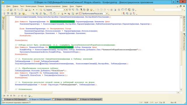 Прием используется в тех случаях, когда необходимо по настройкам пользователя получить данных из базы данных, затем обработать их и вывести в табличный документ Процедура ПолучитьДанныеНаОснованииСКД: https://infostart.ru/public/80164/ Отчет из видео: https://yadi.sk/d/AT9FRoymkp1aUw Содержание: 00:00 Введение, алгоритм решения 00:45 Создание основной схемы. Набор-Объект 03:00 Параметры основной схемы 03:15 Создание схемы извлечения данных. Набор-Запрос 04:43 Копирование параметров в Основную схему 05:32 Обзор модуля отчета 07:15 Оптимизация отборов при выводе 08:40 Обзор отчета в режиме 1С:Предприятие 11:09 Работа без оптимизации отборов 12:50 Обзор процедур в модуле отчета Вакансии по 1С в Neti https://bit.ly/3m6LkOX Instagram https://www.instagram.com/neti.team/ ВКонтакте https://vk.com/neticompany