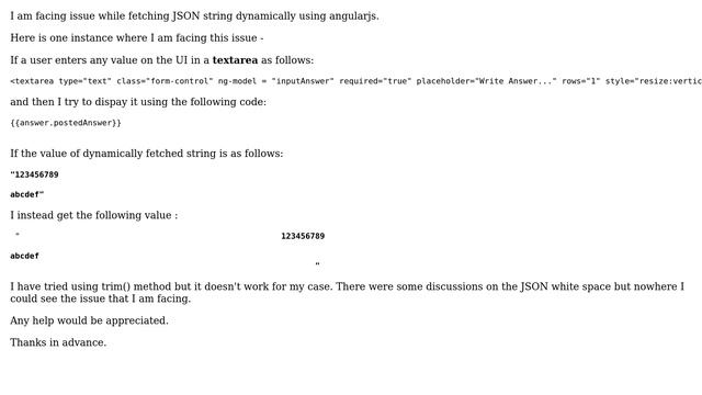 Salesforce: Remove leading and trailing white space from dynamic JSON in angularjs Helpful? Please support me on Patreon: https://www.patreon.com/roelvandepaar With thanks & praise to God, and with thanks to the many people who have made this project possible! | Content (except music & images) licensed under CC BY-SA https://meta.stackexchange.com/help/licensing | Music: https://www.bensound.com/licensing | Images: https://stocksnap.io/license & others | With thanks to user Kshitij Shah (salesforce.stackexchange.com/users/18154), user juhi (salesforce.stackexchange.com/users/10444), and the Stack Exchange Network (salesforce.stackexchange.com/questions/76026). Trademarks are property of their respective owners. Disclaimer: All information is provided "AS IS" without warranty of any kind. You are responsible for your own actions. Please contact me if anything is amiss at Roel D.OT VandePaar A.T gmail.com